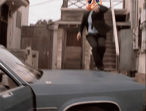 Vceezy Vcente in an action scene, jumping over a blue car while wearing a suit and a bear head.