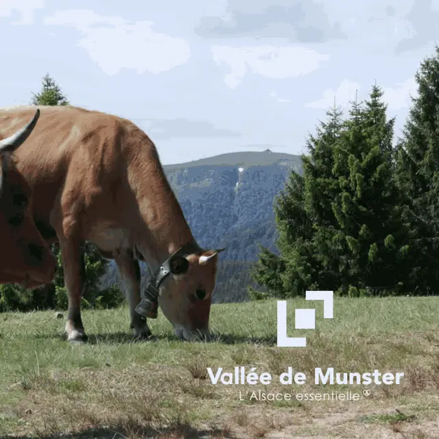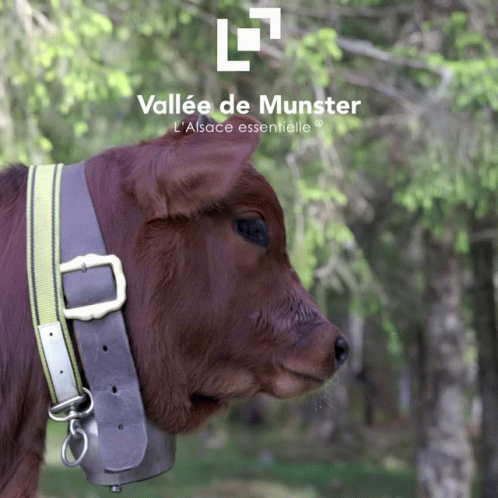 A cute calf with a collar in the beautiful Vallée de Munster, Alsace, France.