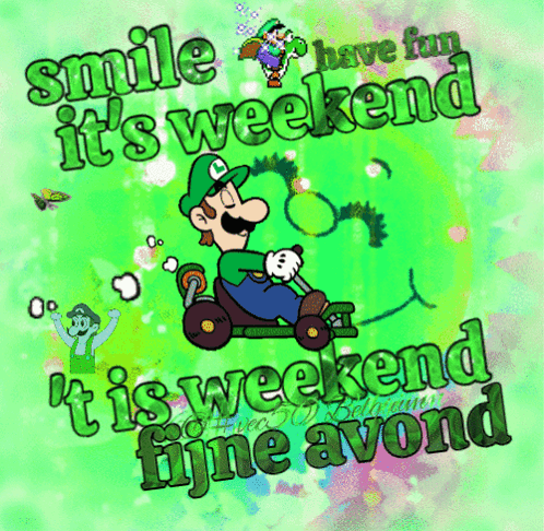 Luigi drives a go-kart in a vibrant animation, wishing a happy weekend with messages 'smile it's weekend' and 'fijne avond'.