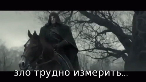 A rider from The Witcher universe on horseback, with the caption 'evil is hard to measure'.