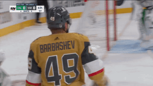 Ivan Barbashev of the Vegas Golden Knights celebrates after scoring a goal during a hockey game.