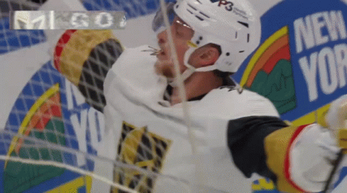 Vegas Golden Knights player Jack Eichel celebrates scoring a goal during a hockey game.