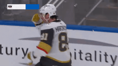 Jonathan Marchessault of the Vegas Golden Knights scores a goal and celebrates on the ice.