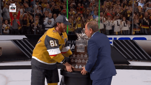 Jonathan Marchessault of the Vegas Golden Knights receives the 2023 Conn Smythe Trophy after winning the Stanley Cup.