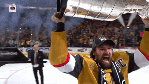 Mark Stone of the Vegas Golden Knights celebrates lifting the Stanley Cup after their championship win.
