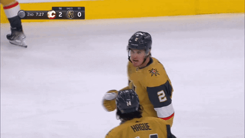 Vegas Golden Knights player Hague scores a goal, celebrating with teammates including Zach Whitecloud.