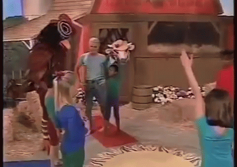 People practice yoga on a farm set, joined by a person in a rooster costume and another in a cow costume.