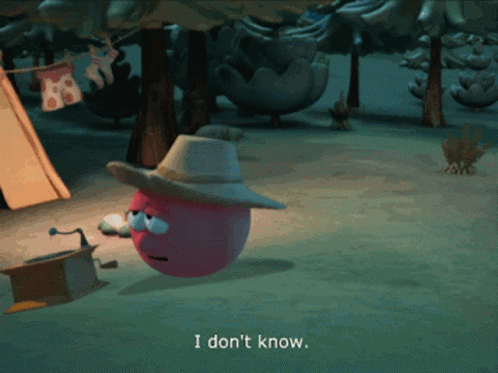 Bob The Tomato from Veggietales, wearing a cowboy hat, expresses confusion by saying 'I don't know'.