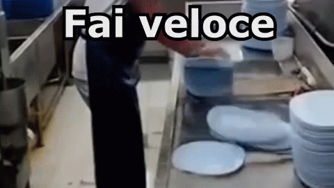 A person rapidly washing plates on a conveyor belt in a kitchen, with the Italian text 'Fai veloce' (Hurry up) overlaid.