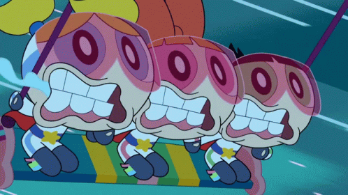 The Powerpuff Girls, Blossom, Bubbles, and Buttercup, experience extreme speed on a swing, looking terrified and drooling.