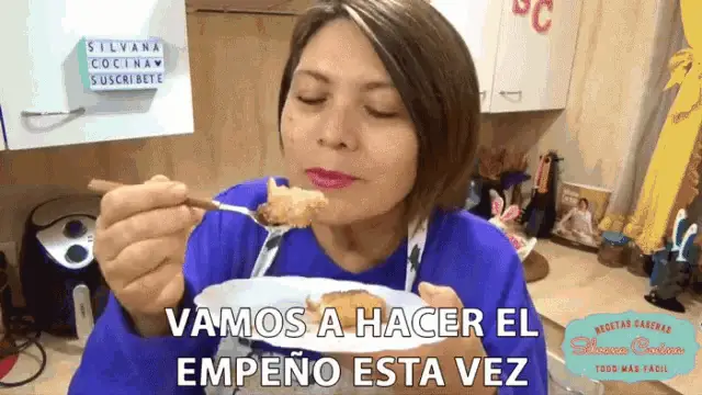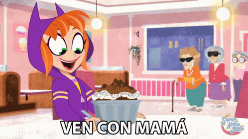 Batgirl happily eating a large chocolate dessert in a diner, with the Spanish caption 'Ven Con Mamá'.