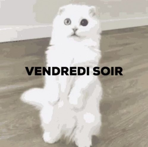 A white cat meme humorously contrasting the energy of Friday night with the exhaustion of Saturday morning.