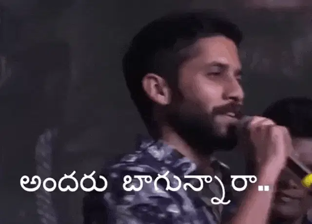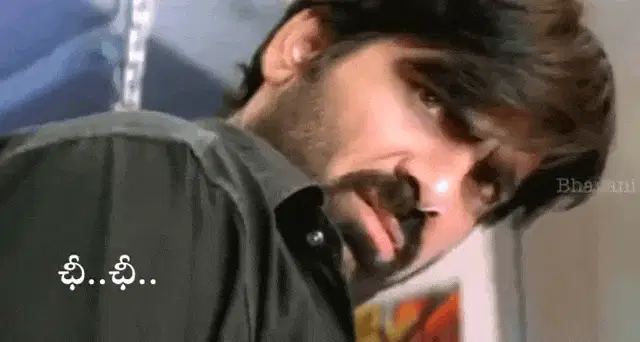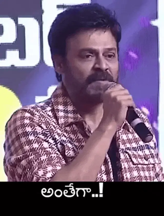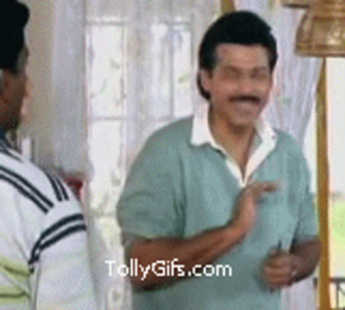 Actor Venky laughing and making a humorous gesture while talking to another man.