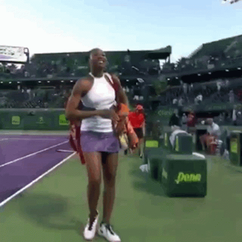 Venus Williams celebrates on the tennis court with a smooth, funky victory dance after a match.
