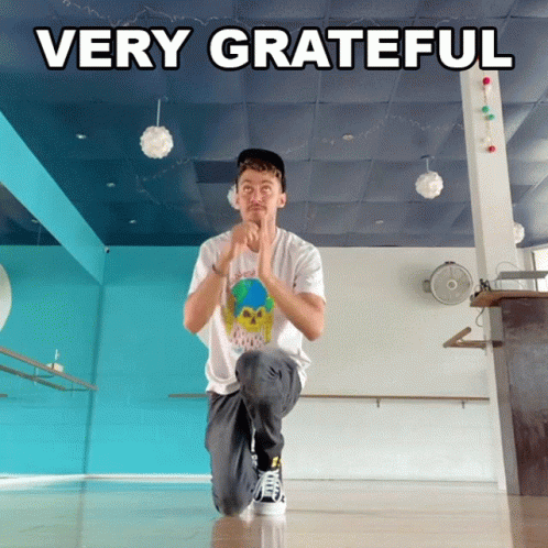 Casey Frey kneels in a dance studio with "VERY GRATEFUL" text, expressing gratitude.