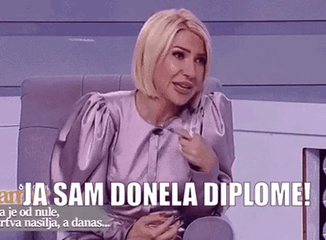 Vesna Rivas sitting on a couch with arms raised, smiling, with a towel that says 'Bono' next to her.
