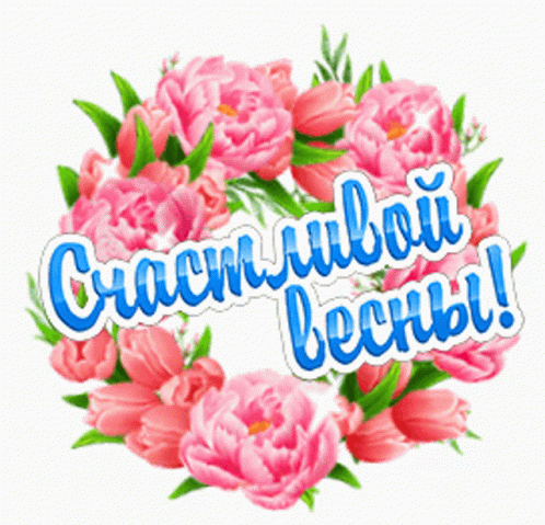 A beautiful wreath of pink peonies and tulips with messages 'Happy Spring!' and 'Thank you for the gifts!'