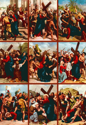 A collage of religious paintings depicting the Stations of the Cross and the Resurrection of Jesus Christ.