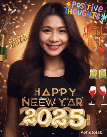 Smiling woman celebrates Happy New Year 2025 with festive confetti, champagne, and positive thoughts.