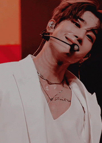 Victon's Seongwoo captivates with a charming smile, wearing a white jacket and microphone headset on stage.