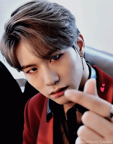 Victon's Kang Seungsik makes a cute finger heart gesture, then smiles brightly for the camera.