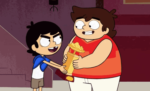 Victor and Valentino joyfully celebrate their victory, holding a golden trophy high in the air with big smiles.
