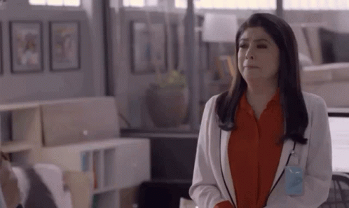 Victoria Ruffo as Maura in an emotional scene, wearing a red shirt and white coat.