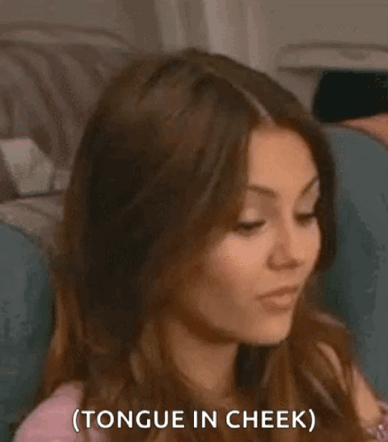 Victoria Justice making a playful 'tongue in cheek' expression while sitting on a couch.