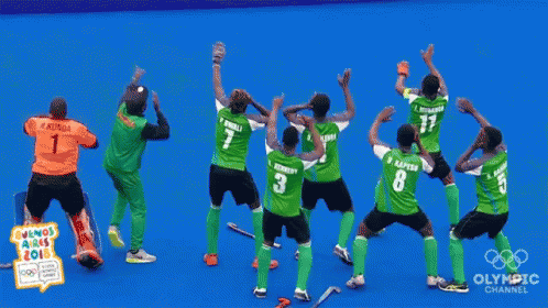 A field hockey team celebrates their victory with an energetic dance on the blue field at the Buenos Aires 2018 Youth Olympics.