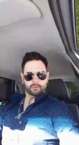 Man with beard and sunglasses in a blue shirt, enjoying Friday vibes in his car.