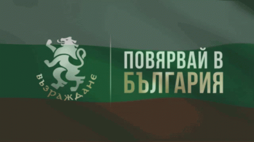 Bulgarian political party Vazrazhdane's logo with a lion and the slogan 'Believe in Bulgaria' against a flag background.