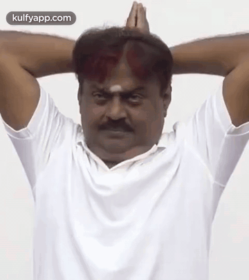 Vijayakanth makes a funny blinking face with hands behind his head, wearing a white shirt.
