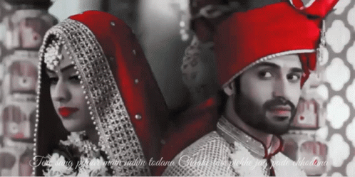 Vijayendra Kumeria and Nia Sharma as a newlywed couple in traditional Indian wedding attire, looking over their shoulders.