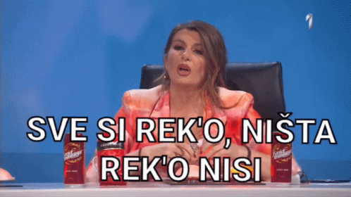 Viki Miljkovic on Zvezde Granda, reacting with the phrase 'You said everything, you said nothing' while sitting at a desk.