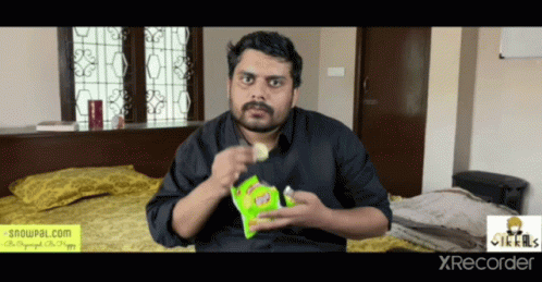Vikkals Vikram, also known as Vikram Arul Vidyapathi, sits on a bed, eating chips from a green packet with a serious expression.