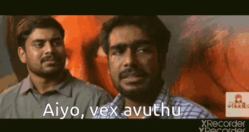 Vikram Arul Vidyapathi reacts with annoyance, saying "Aiyo, vex avuthu," while Sibi Jeyakumar watches.