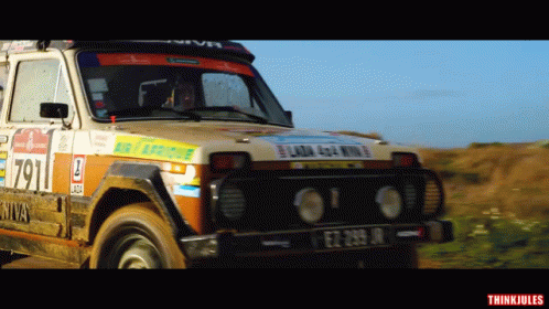 Sylvain Vilebrequin and Pierre Vilebrequin tackle a rally course in their iconic Lada Niva, number 791, kicking up dust.