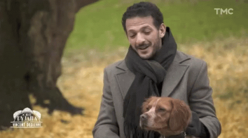 Vincent Dedienne smiles while holding a brown and white dog in an outdoor park setting, featured on TMC.