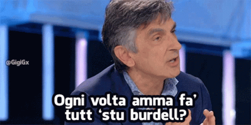 Vincenzo Salemme asks 'Ogni volta amma fa' tutt 'stu burdell?' on a TV show.