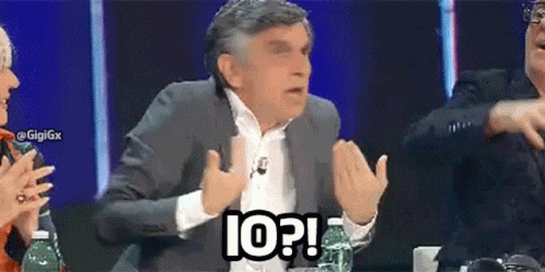 Vincenzo Salemme reacts with a surprised expression, exclaiming 'IO?!' (Me?!) during a segment of 'Tale E Quale Show'.