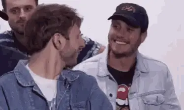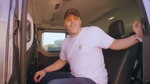 Vinsi Vso in a white shirt and cap, sitting in the back of a van, gesturing and smiling.