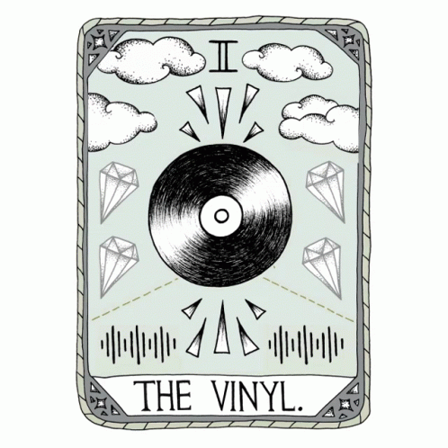 An illustrated tarot card, labeled "THE VINYL.", featuring a vinyl record, clouds, and diamonds.