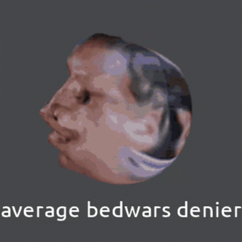 A distorted 3D animated head with the text 'average bedwars denier' from Vip Eggware Bedwars.