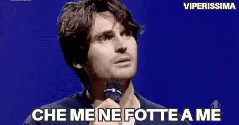 Angelo Duro on stage, holding a microphone against a blue background, delivering the iconic phrase 'Che me ne fotte a me'.