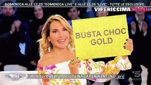 Barbara Durso smiles, holding a "Busta Choc Gold" sign on "Pomeriggio 5" or "Viperissima Trash".