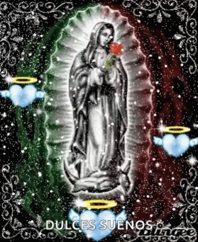Stylized image of the Virgin Mary holding a rose, surrounded by glowing hearts and halos, wishing sweet dreams.