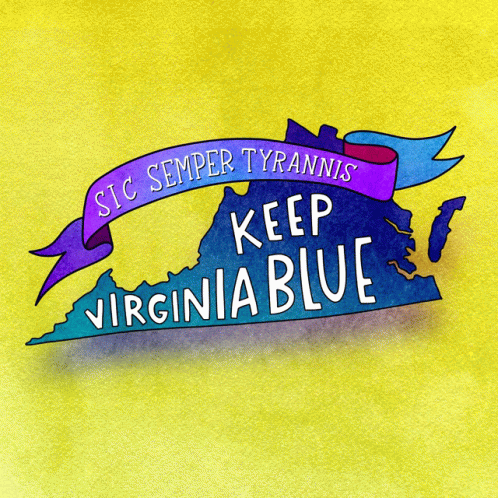 Stylized map of Virginia with 'Keep Virginia Blue' and 'Sic Semper Tyrannis' banner, reflecting political sentiment.