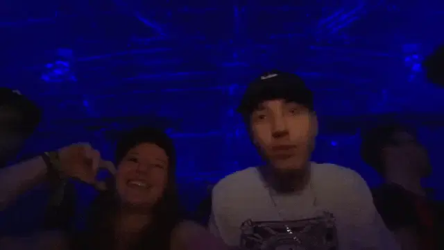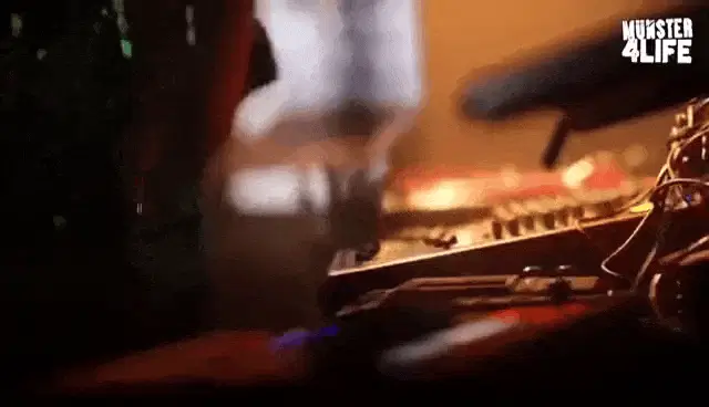 Virtual Riot delivers an energetic dubstep performance, making dynamic hand gestures behind the DJ deck.