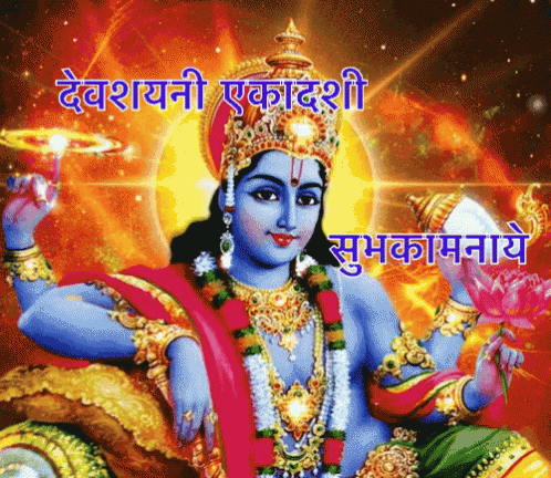Lord Vishnuavatar depicted for Devshayani Ekadashi, with wishes in Hindi.