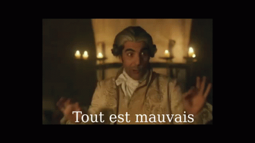 A man from 'Visiteurs' in a historical wig exclaims 'Tout est mauvais' and 'C'est un festival'.